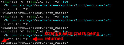 | Description | Hello list, I'm about to log this into mantis but wanted to post also. In 3.3.717 I started using the mysql features of ldmud. They've been working well until I upgraded to 3.3.718. This reboot (using 3.3.718 now) I'm getting bugs with db_conv_string returning strange ascii characters. Example: db_conv_string("domains/areas/apollo/floor1/entr_castle") LPC result: " "D Ô Ô I will also attach a screenshot. This seems to happen on any string I use over 27 characters! lpc db_conv_string("testtesttesttesttesttesttesttesttesttest") LPC result: ""DP „µ• testtesttesttesttesttesttesttest" uuga @ dragonfire | ||||